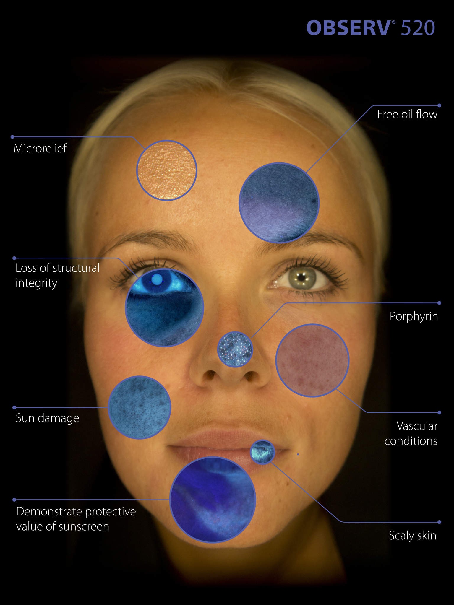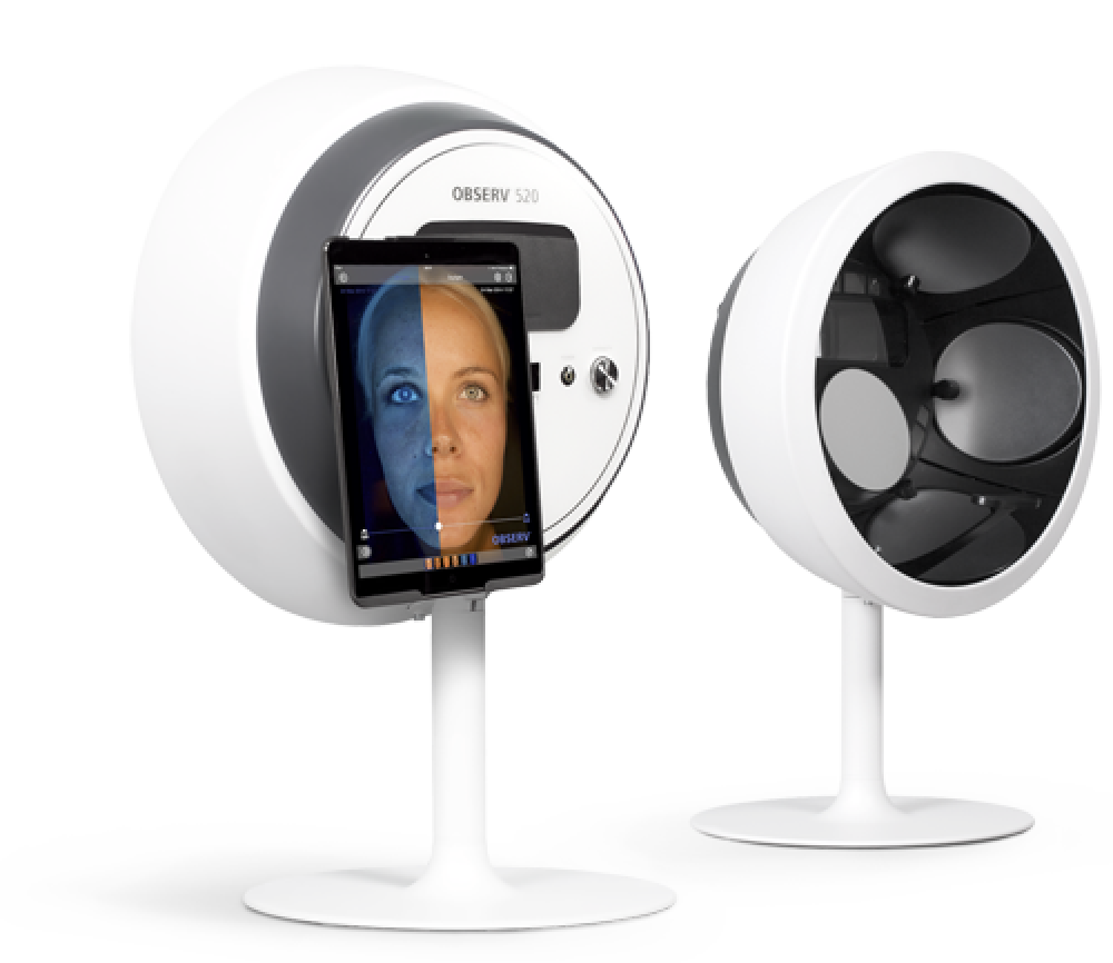Met de Observ is het mogelijk om de gezichtshuid onder invloed  van verschillende huidanalyse-modi te bekijken en vast te leggen.